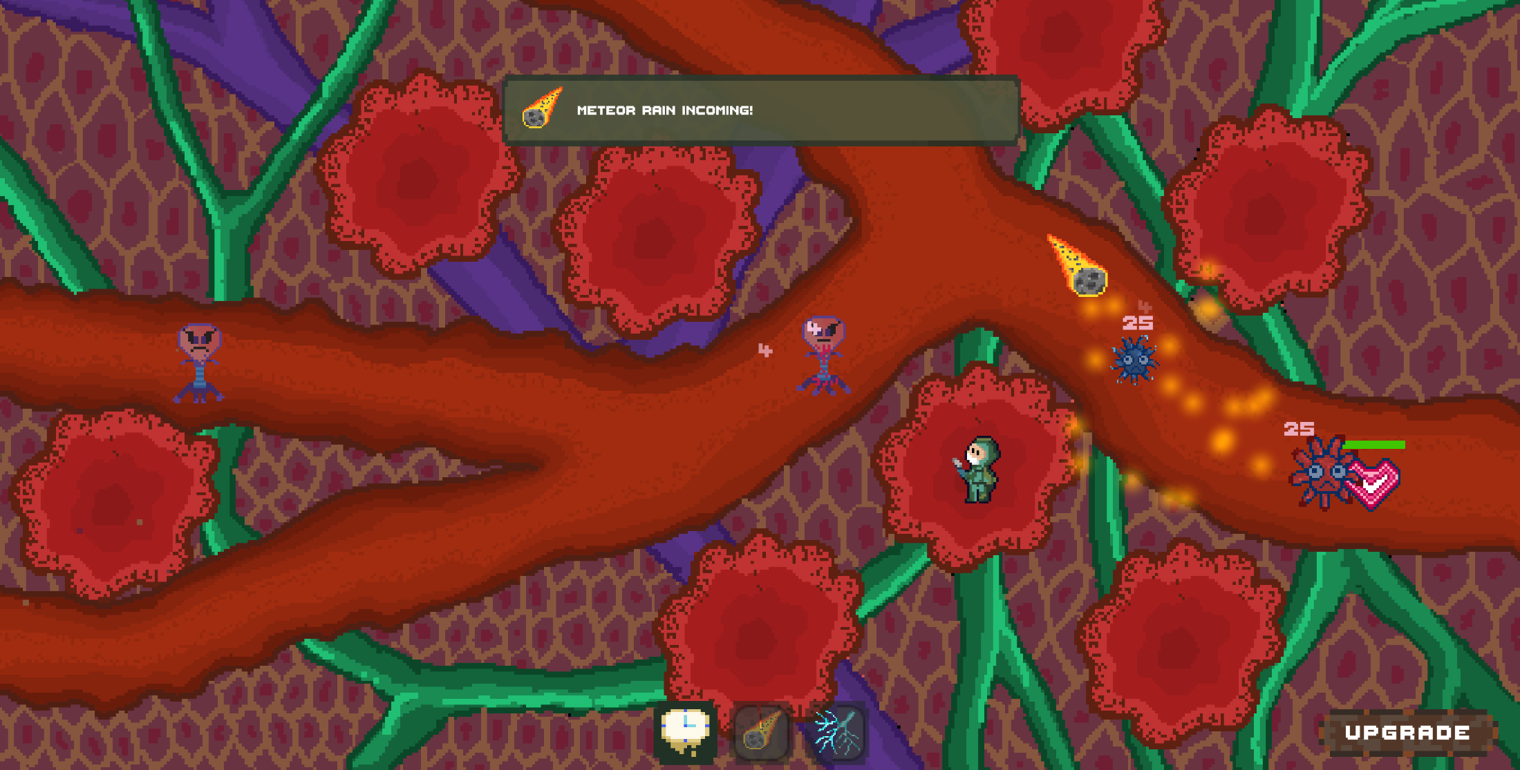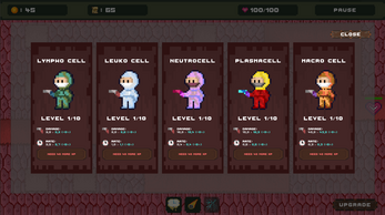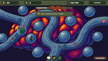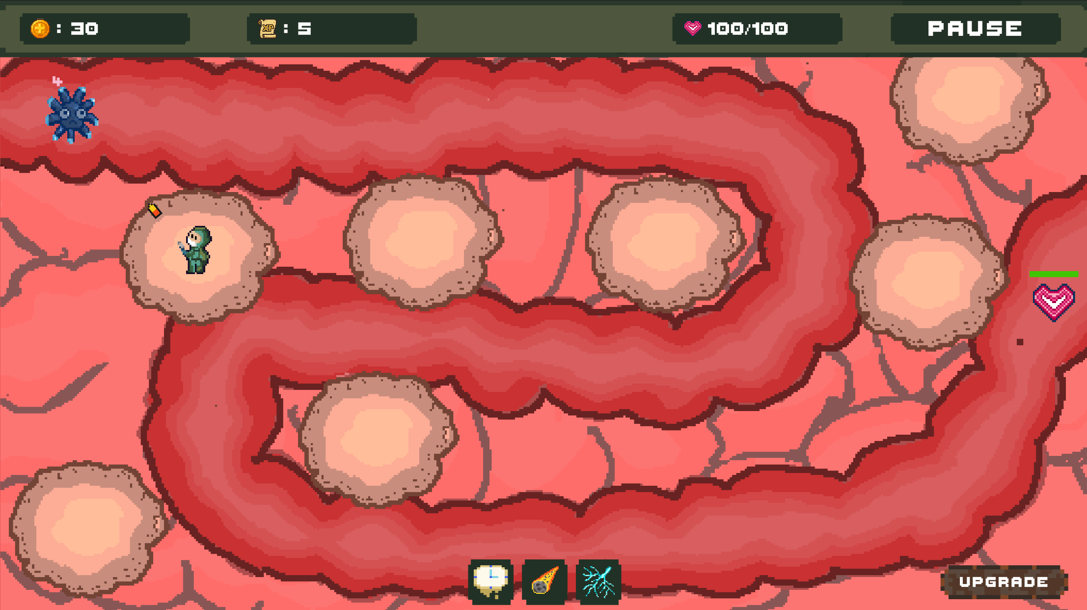 A 2D pixel-art tower defense game set deep inside the human body. Deploy immune towers to combat waves of deadly viruses in stylized anatomical environments. Use experience points to evolve your defenses, unlock powerful upgrades, and survive the ultimate biological boss.
